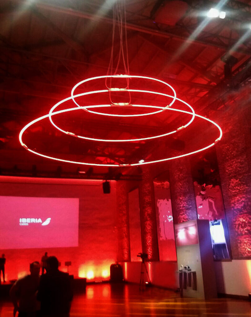 Luminarias Singulares de Neón: Escultura Lumínica y Expresión de Marca Única. La categoría de Luminarias Singulares de Neón representa nuestra máxima capacidad de innovación en el diseño lumínico, elevando la luz a una forma de arte arquitectónico y de branding. Por ello, nos especializamos en proyectos que exigen piezas únicas que rompen con lo convencional, diseñadas para ser el punto focal indiscutible de cualquier espacio de lujo, corporativo o retail de alto impacto. Proyecto de luminaria singular para IBERIA en Madrid.